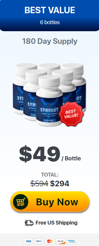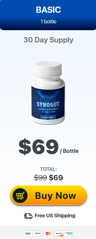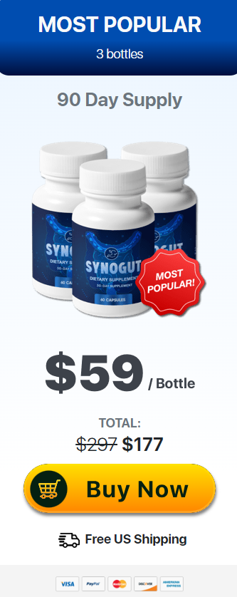 SynoGut is available in different package options. A single bottle (30-day supply) costs $69, while the most popular option, a 3-bottle package (90-day supply), costs $177 ($59 per bottle). The best value is the 6-bottle package (180-day supply) for $294 ($49 per bottle). All packages come with free US shipping and a 60-day money-back guarantee.